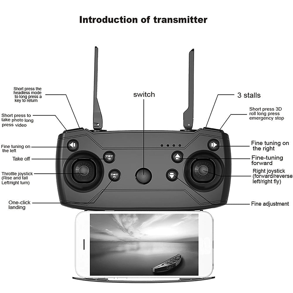 Função: Avanço / recuo, subida / descida, deslocamento lateral esquerdo / direito, rotação esquerda / direita, flutuação, decolagem / aterrissagem de uma tecla, modo sem cabeça, retenção de altitude, retorno de uma tecla, controle Wifi, foto / vídeo